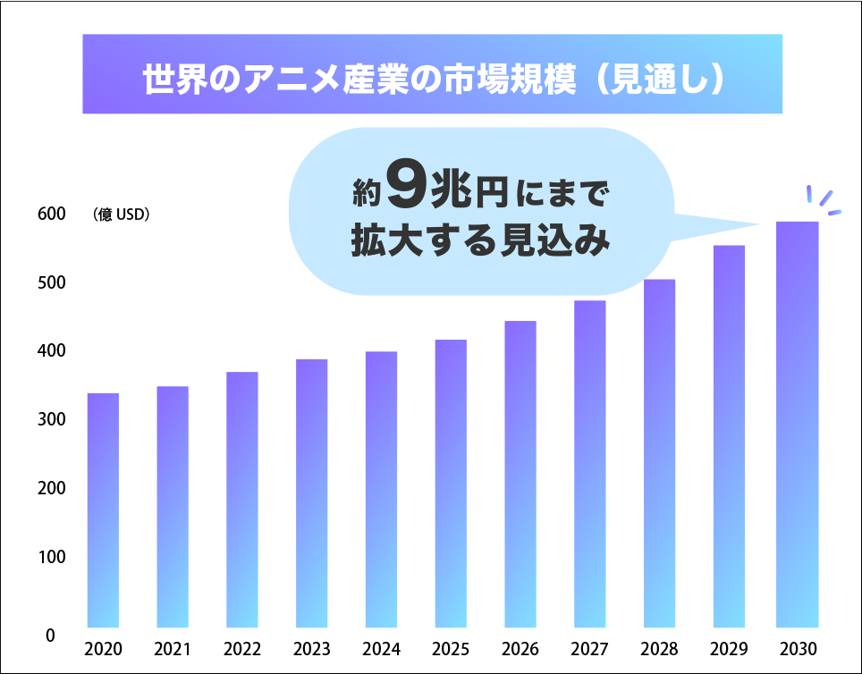 Netflix、Huluなどの主要プラットフォームでアニメ需要が急増しており、アニメ市場は2021年時点でグローバルで約5兆円、2030年には約9兆円にまで拡大していくと予測されています。