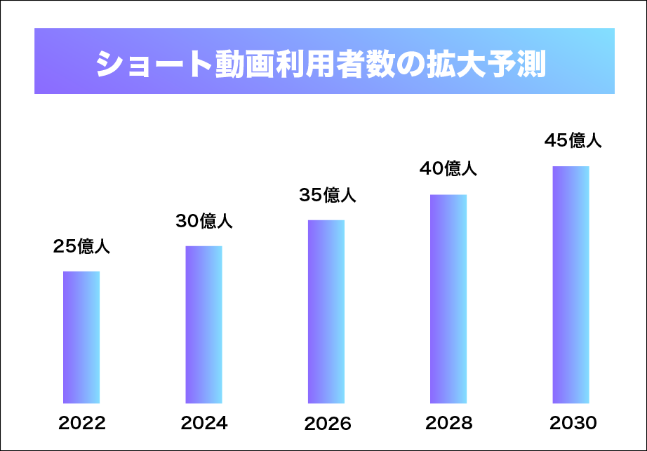 ショート動画市場は今のペースでいけば、年率16%で右肩上がりに成長し、ユーザー数は2030年には45億人にも達すると予想されています。