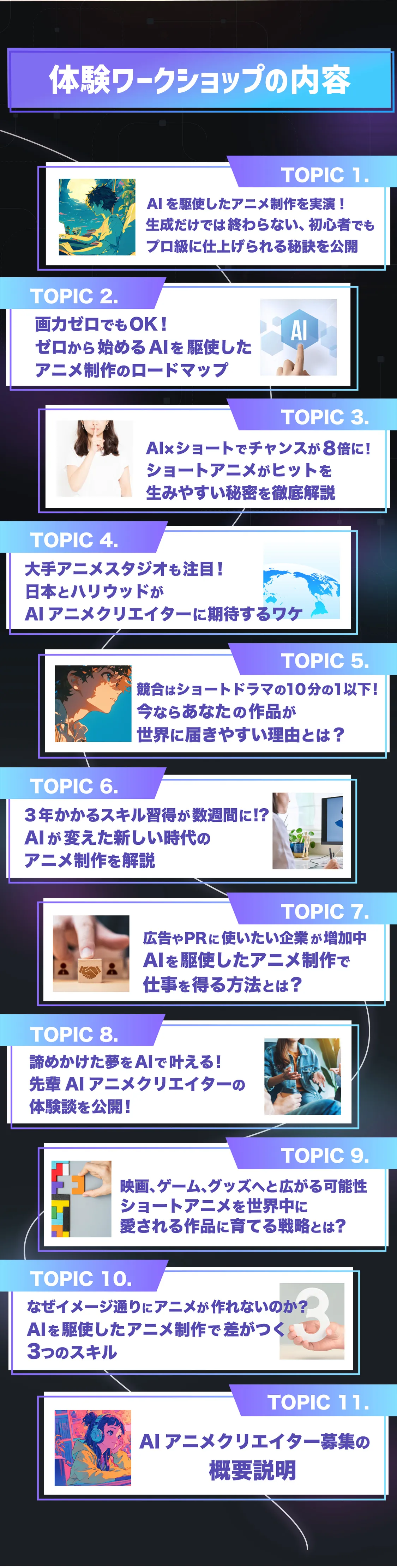 「アニメが作りたい…」という思いさえあれば、未経験で知識ゼロでも、ショートアニメを作るためのフローや知識を知り、AI活用のコツやルールを掴めば、AIアニメクリエイターを目指すことが可能です。